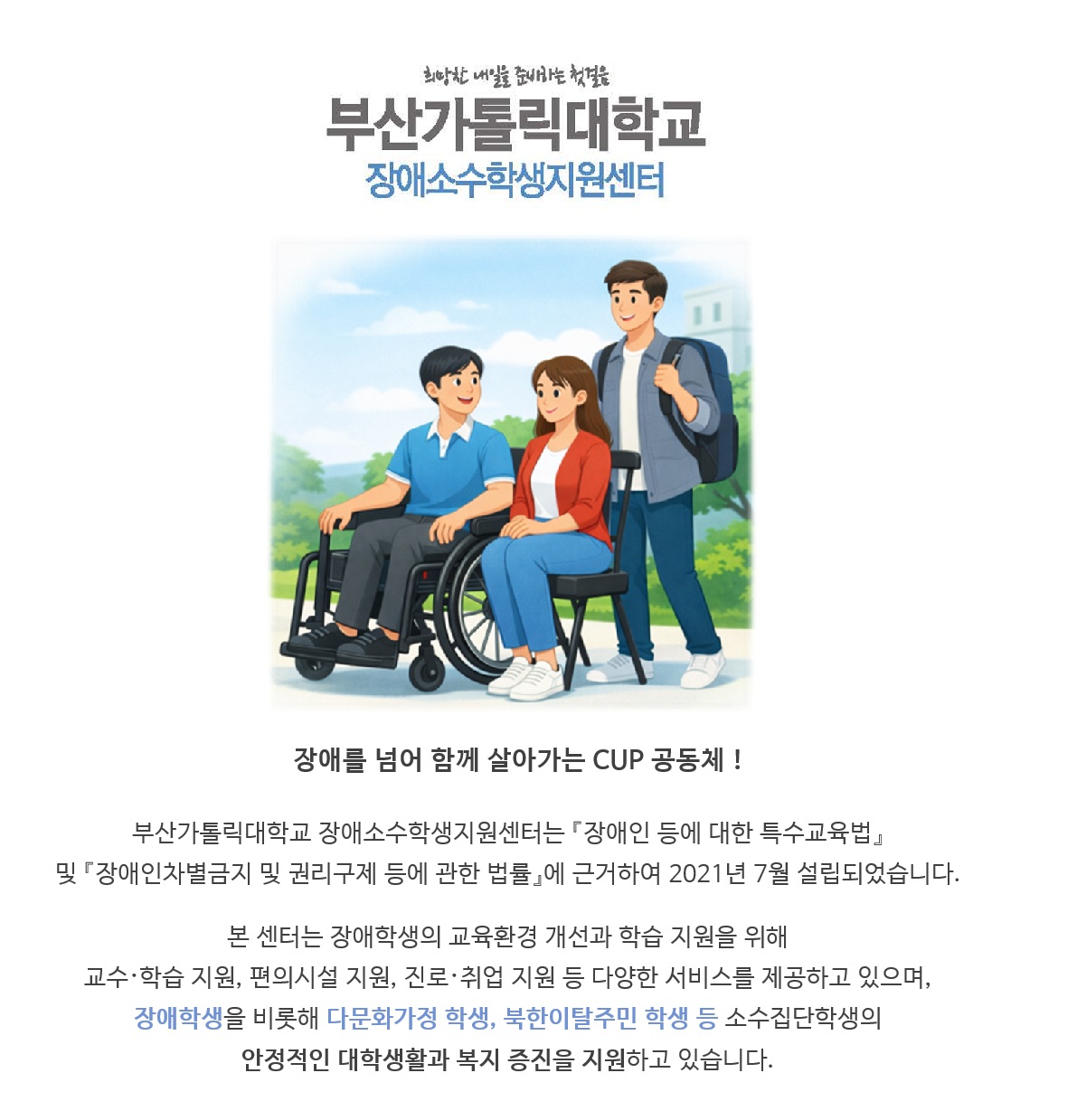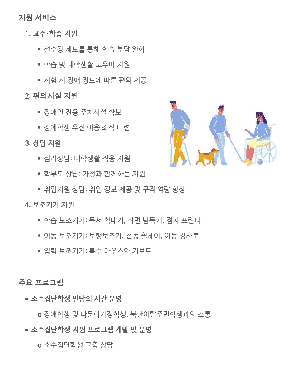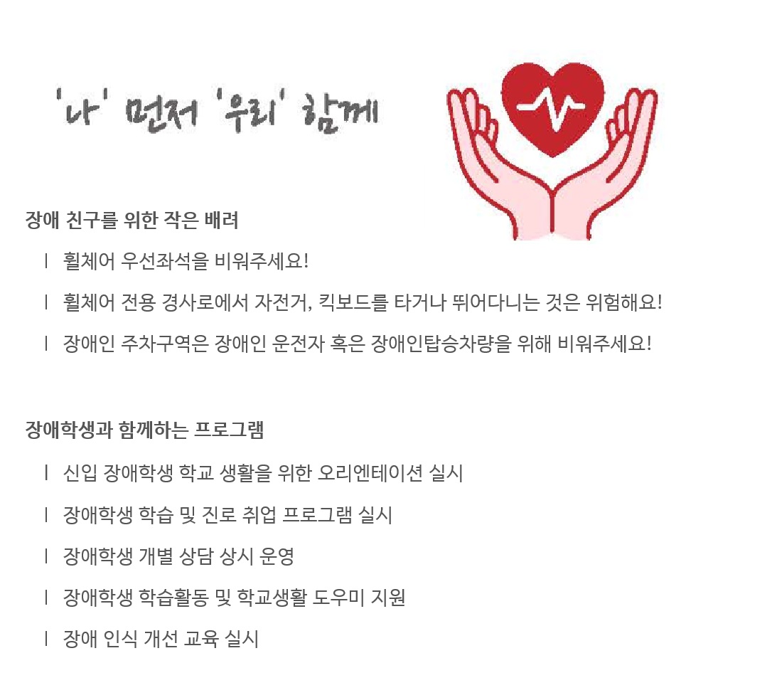 장애(소수집단)학생의 교육환경개선 및 학습지원을 위한 통합지원체제를 수립하고 운영하여 교수·학습지원, 대학생활 및 편의시설지원, 진로·취업지원 등의 서비스를 제공함으로써 장애(소수집단)학생들이 학교생활을 즐겁게 할 수 있도록 지원합니다.
